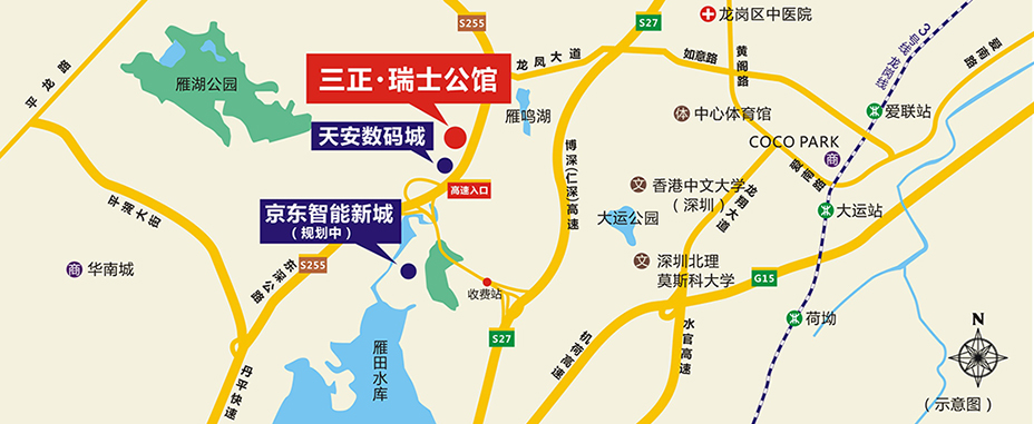 “京東·都市人工智能產業(yè)新城”項目位于鳳崗鎮(zhèn)雁田村,距離三正瑞士公館僅幾百米距離。